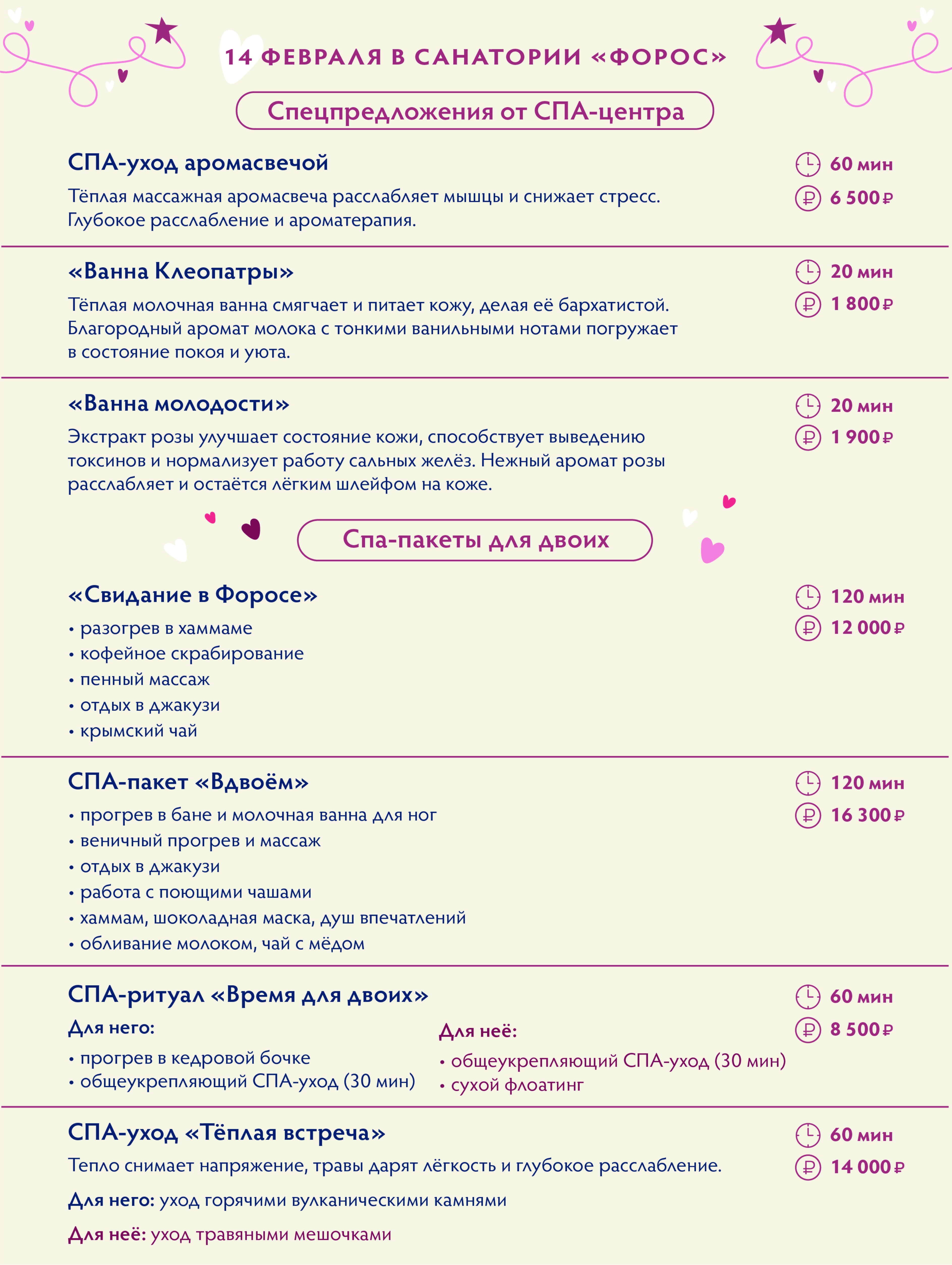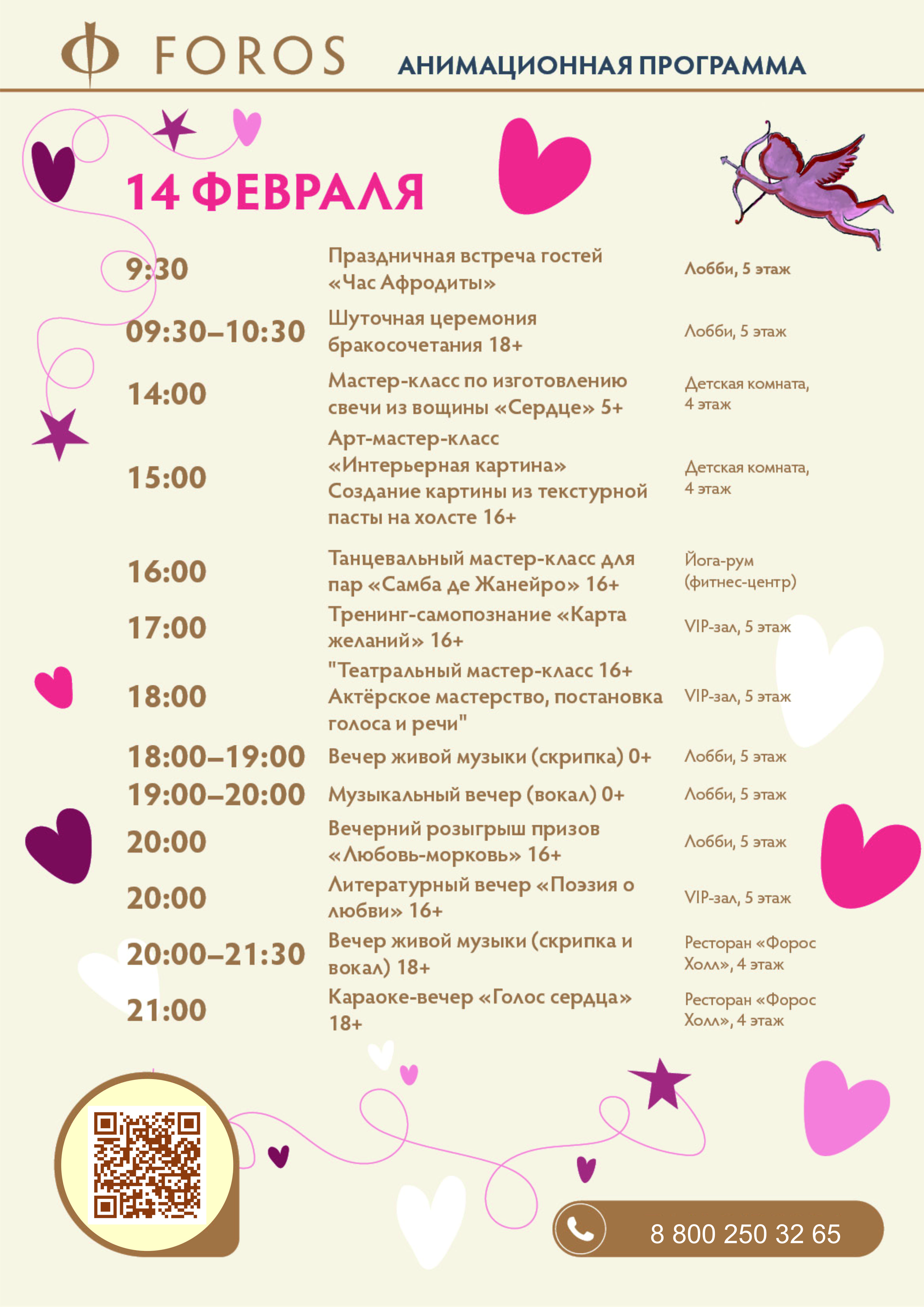 14 февраля гля гостей санатория праздничная встреча в атмосфере античной любви, шуточная церемония бракосочетания, творческие и танцевальные мастер-классы, вечерние программы с поэзией, музыкой и караоке создают лёгкое, живое настроение праздника чувств.